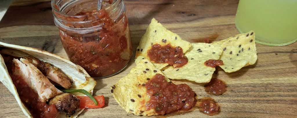 Ditch the jarred salsa and make your own big batch for now and later. Comes together in about 30 minutes and can be refrigerated up to one month. Remember to unwind with a margarita and open a bag of chips.